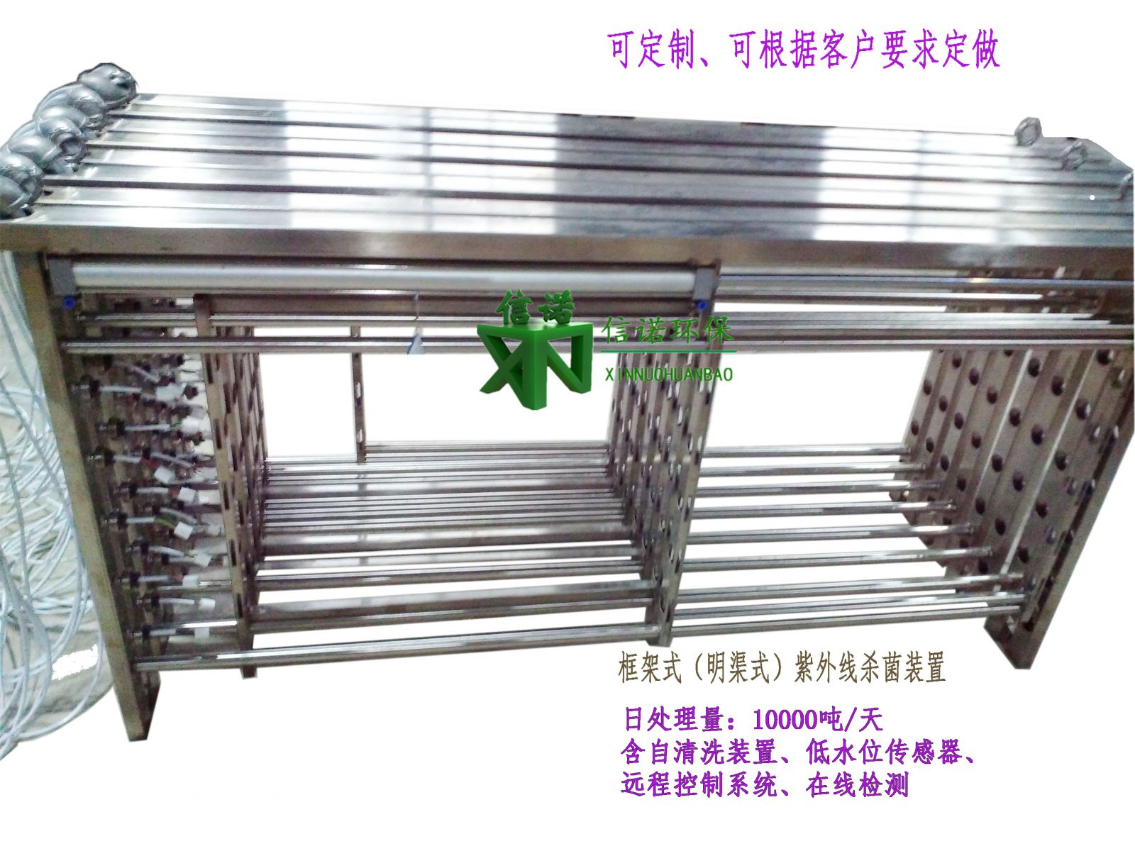二、產品介紹框架式(明渠式)紫外線消毒器是通過布置于開槽溝渠 內的紫外消毒模塊上的紫外燈發(fā)出中心輻射波長為253.7nm的短波紫外線對流經溝渠的水體進行殺菌消毒,從而解決處理后的污水細菌指標的超標問題,使**終排放水體的細菌學標達到并超過國家相關排放標準及水質標準要求。